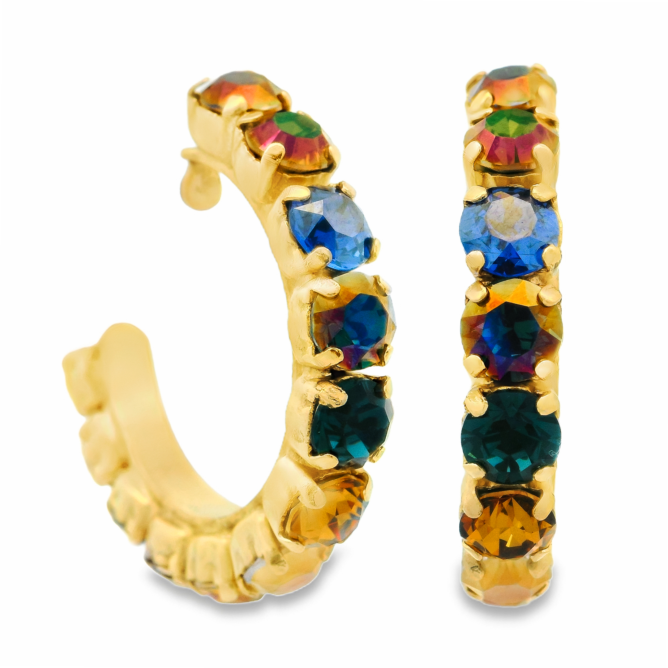 These Jubilee Hoop Earrings in Midnight Express are a sizzling style statement!  They're the perfect indulgence for any gold-loving gal. The tarnish-resistant antique gold-plated brass metal is hypoallergenic and encrusted with dazzling high-quality crystals, so you'll make a sparkling statement without a scratchy situation. And with 1.5" of wonder, they'll be sure to turn heads whenever you wear them. Get your lava-star worthy look today!