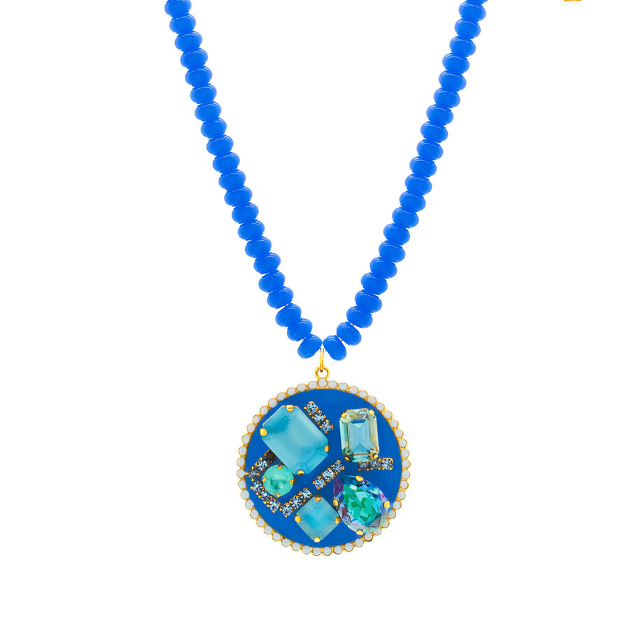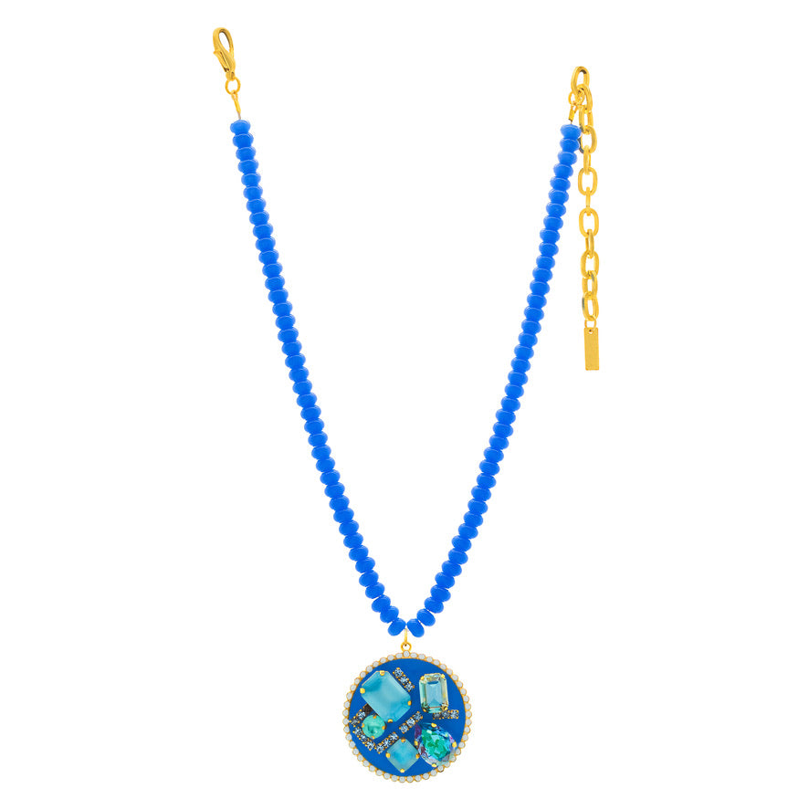 Make a statement with this Ezana Necklace in Blue! Show off your personality with its antique gold plated brass base metal, high quality crystals, hand painted enamel and beautiful beads add an extra touch of glam. 16" in length with 1.75" drop and 3.5" extension. Designed and made in Canada.