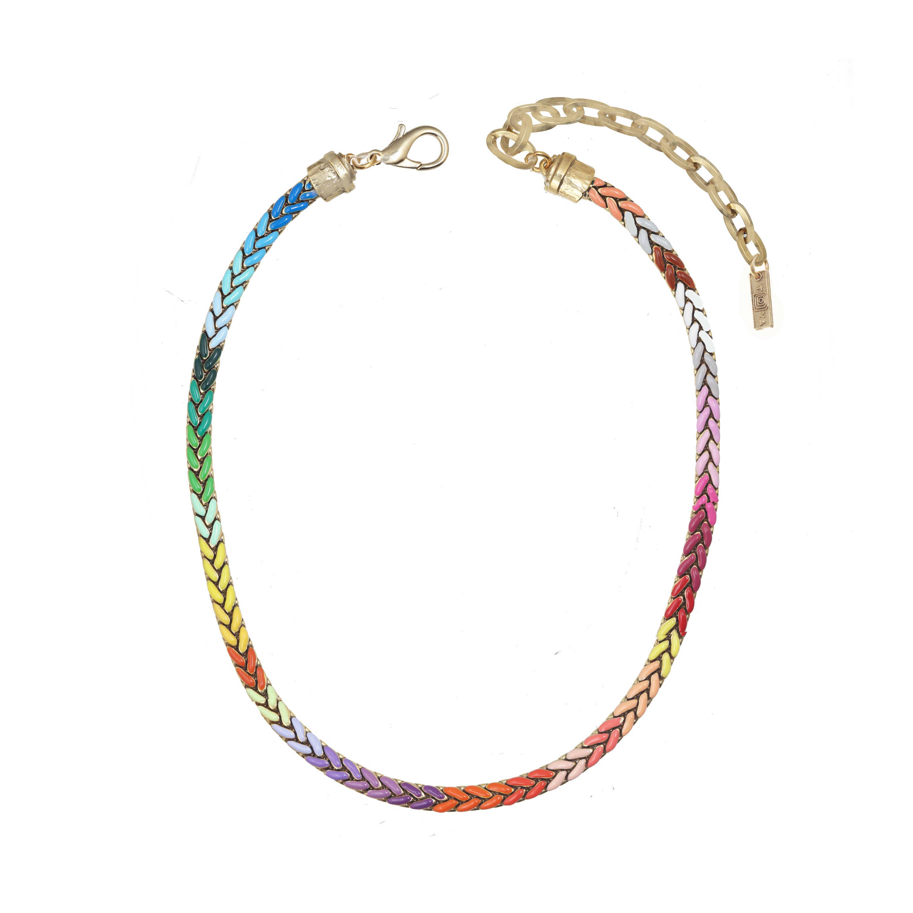 Selina Necklace in Rainbow, a stunning piece that embodies timeless beauty and sophistication. This antique gold-plated necklace features a 16” length (with 3" extension) adorned with hand painted enamel.