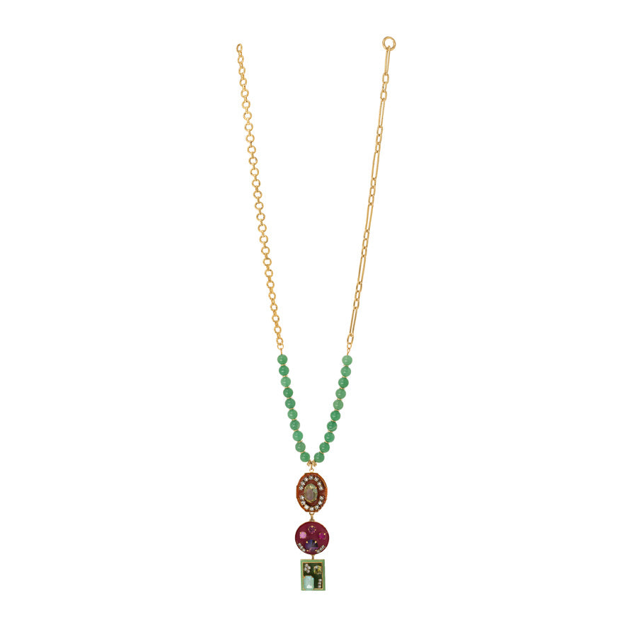 Liven up your look with the Vespera Necklace! This sparkly stunner will have you turning heads, featuring high quality crystals, hand painted enamel, and beautiful beads, and an antique gold-plated brass base metal. Whether you're clinching a big deal or just looking to impress, this beauty's 36" in length with a 4.5" drop will do the trick. Oh la la!
