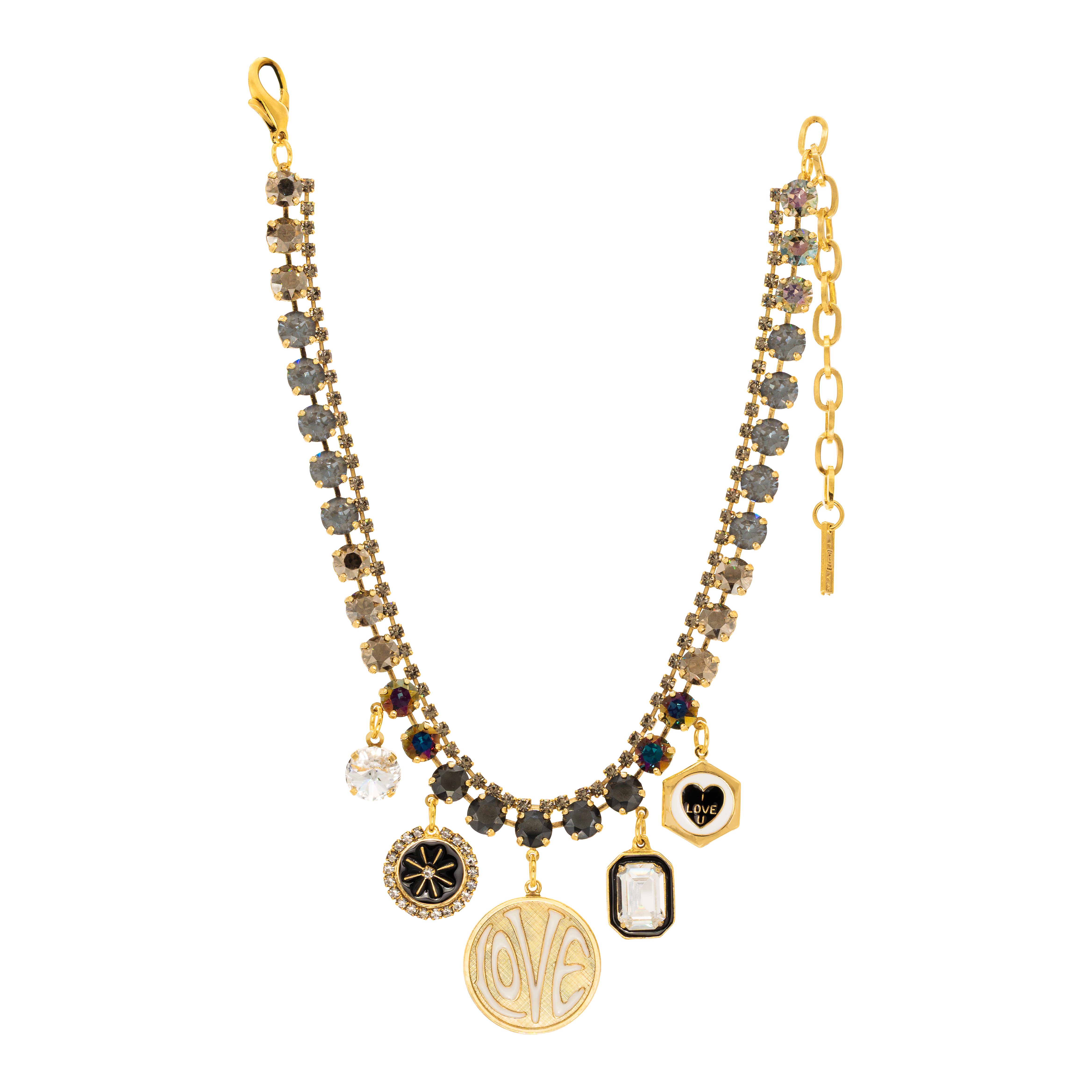 Make a statement with this Jordan Necklace! Show off your personality with its antique gold plated brass base metal, high quality crystals and hand painted enamel add an extra touch of glam. 12.5" in length and 3" extension.