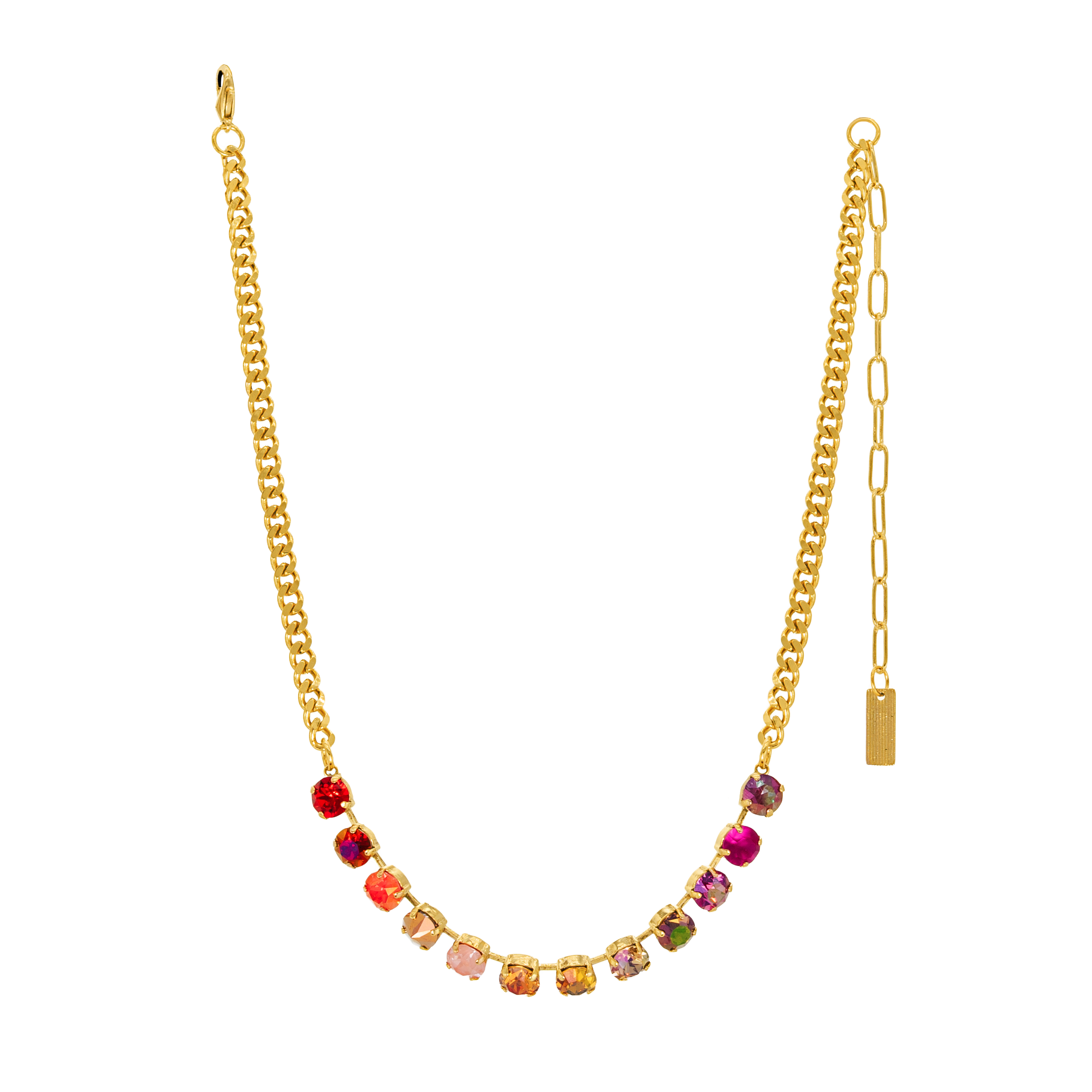 Glimmer and shine in this Mini Oakland in Flamingo Mix! This stunning necklace is gold-plated in brass, and lined with high-quality crystals. Perfect for any occasion, this 13" necklace with a 3" extension has you covered from day to night.