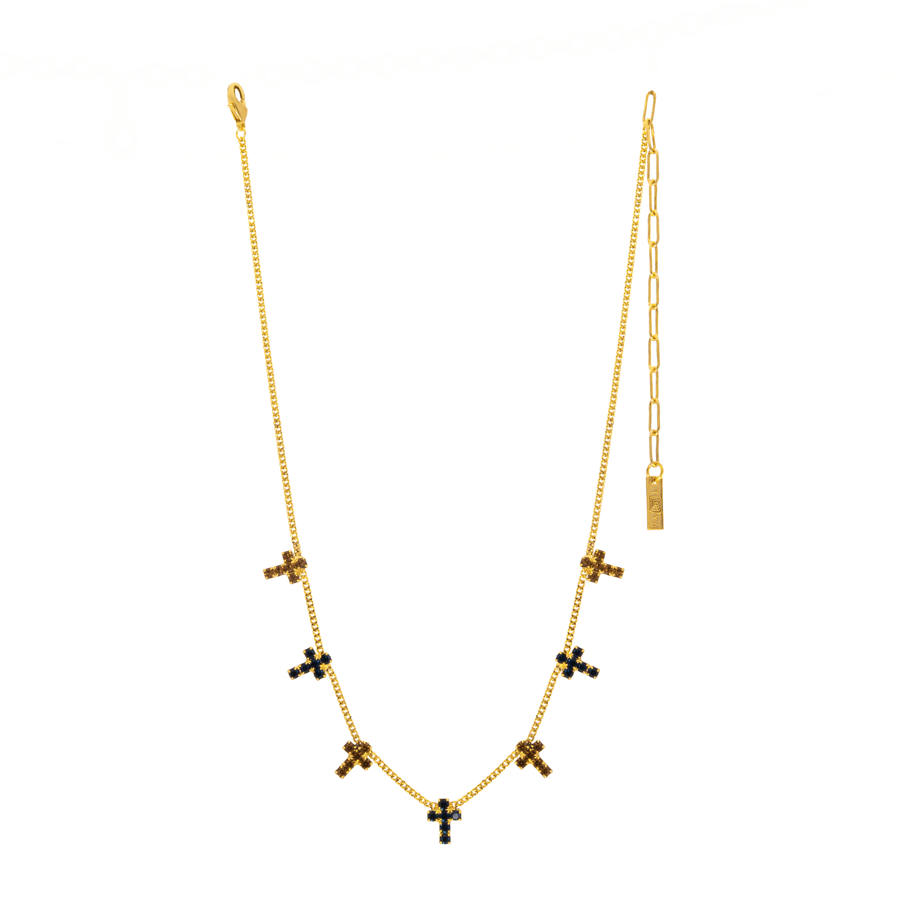 This dashing Multi Cross Necklace in Midnight Express is the perfect way to up-level any look and make your neck the envy of all! Crafted with high-quality brass that's plated with antique gold and featuring a myriad of shimmering crystals, this breathtaking beauty has a 16" length chain with a 2" extender. Hand-made in Canada with panache!