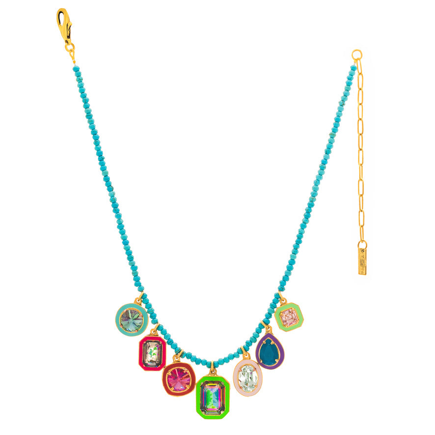 Make a statement with this Clemmy Necklace! Show off your personality with its antique gold plated brass base metal, high quality crystals, hand painted enamel and beautiful beads add an extra touch of glam. 17" in length and 4" extension. Designed and made in Canada.