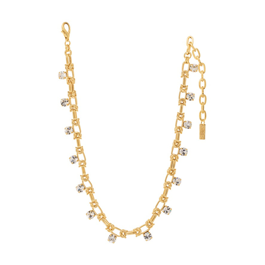 Add a touch of vintage glamour with the Priscilla Necklace in Antique Gold. The antique gold plating and high quality crystals bring a touch of elegance to any outfit. With a 15" length and 4" extension, this brass-based necklace is versatile and made to last.