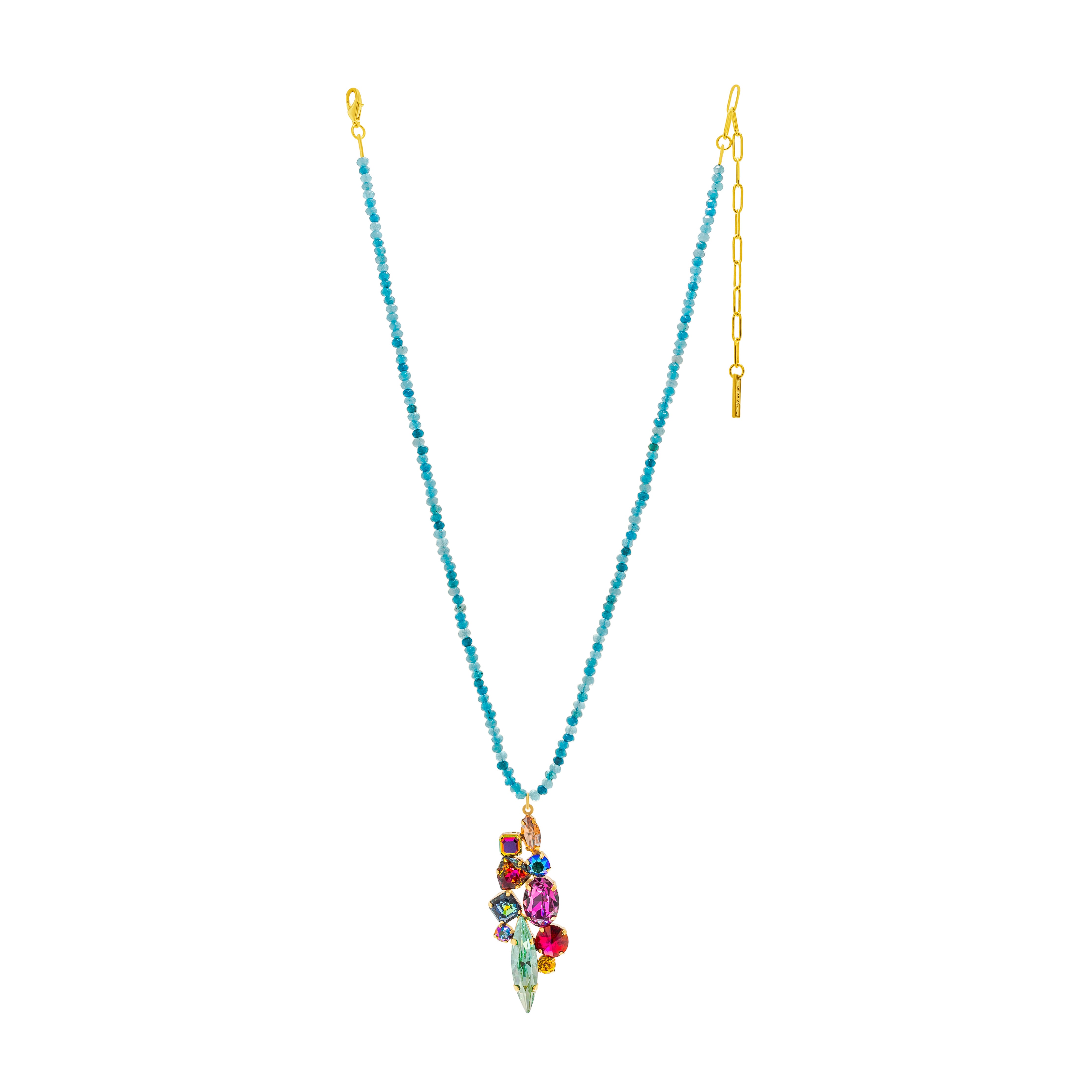 Make a statement with this Amira Necklace! Show off your personality with its antique gold plated brass base metal, high quality crystals and turquoise beads add an extra touch of glam. 19" in length with 2.5" drop and 4.5" extension. Designed and made in Canada.